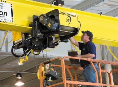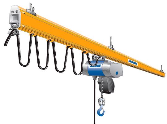 هـ – جرثقیل منوریل (Monorail Crane) جرثقیل متحرکی است که دستگاه بالابر و اطاقک فرمان آن ( در صورت وجود ) در حال آویز توسط چرخهائی که روی یک ریل فوقانی حرکت میکند جابه جا گردد.