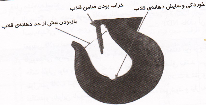 –  اگر در بازرسی چشمی یا غیر مخرب در هر قسمتی از قلاب مطابق شکل زیر ترک مشاهده گردید می بایست نسبت به تعویض یا تعمیر آن اقدام گردد.