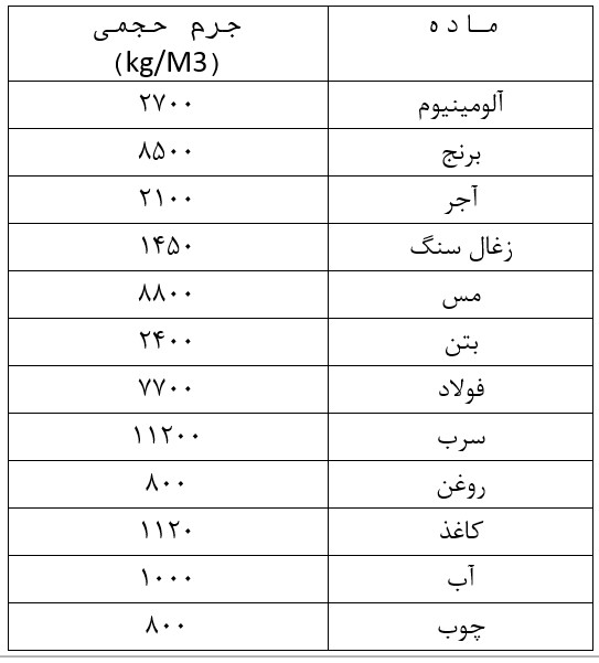 جرم حجمی چگالی مواد پرکاربرد در پروژه